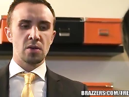Beautiful brunette babe with tight and juicy boobs, amazingly slender sexy body shape and wonderful round butt is getting fucker's pants pulled off and tightly erects his dick with smooth blowjob and then lies on the desk with wide open legs dressed in black stocking and pleasures passionate fuck