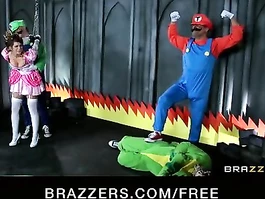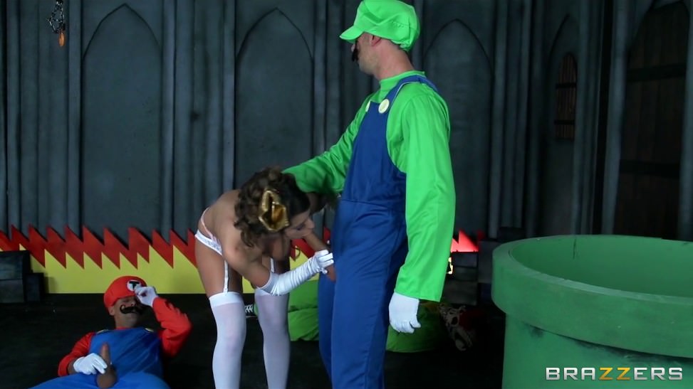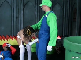 Two huge dicked fucker dressed in kinky cartoon suits trapped wonderful busty brunette chick in queen suit and cuffed her hands to the sealing. Girl tightly blowjobs one huge cock and gets pleasantly fucked in shaved tight pussy from behind by second fucker