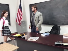 Sexy teen brunette student chick got her teacher sitting on chair with pulled down pants and standing on her knees on the floor to erect his precious big dick with tight deep blowjob and then getting bent in many hot poses and fucked hard on his desk