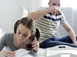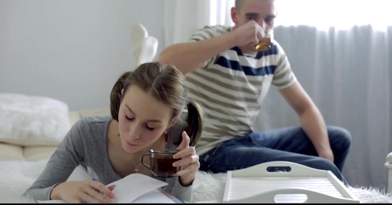 Sweetie in sexy short skirt and cute knee socks is lying on the bed and having her boyfriend pulling up her blouse and sucking her nipples and then gently stroking her yummy pussy and turning on her sexual desires and then satisfies her with hardcore fuck