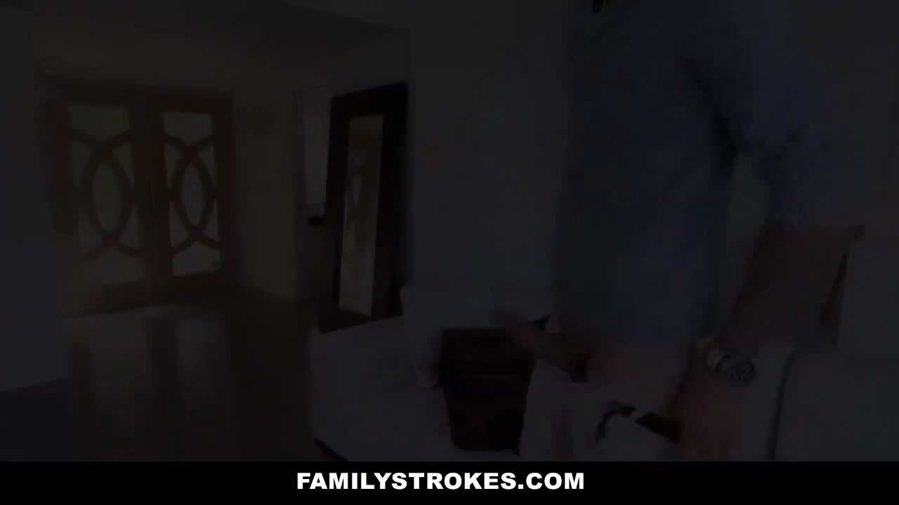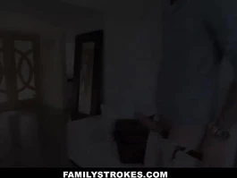 Sexy slender shaped young blonde chick sits on the floor on her knees and does tight deepthroat blowjob to her nerd stepbrother until his big dick erects hard and then enjoys bending over nude and being fucked in shaved pussy from behind with huge cock