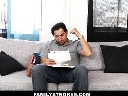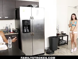 Sexy shaped young brunette with round bubble butt and tight boobies is coveting to her stepfather and hotly exciting him with smooth deepthroat blowjob and then having shaved pussy fucked hard in various hot sex poses on the kitchen counter