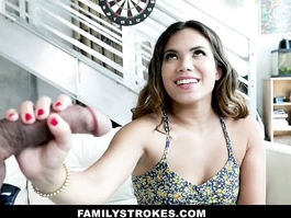 Steaming hot young brunette chick with beautiful round bubble butt and sexy small boobies is gently fondling stepfather's big dick and deepthroating it before having light haired pussy hotly licked off and enjoying hardcore fuck in rather positions