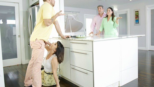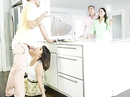 Precious young brunette chick wearing sexy short fluffy skirt is sitting on her knees on the floor and doing tight deepthroat blowjob to her cousin and tightly erecting his huge cock and then enjoys being turned in rather poses and fucked hard in shaved cunt