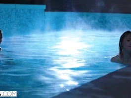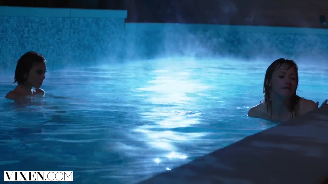 Slender sexy shaped young brunette girlfriends are sneaking to the backyard and having fan in the private pool at night; hot chick pulls off her red underwear and wide spreads legs to get her shaved pussy pleasantly licked off by dirty girlfriend