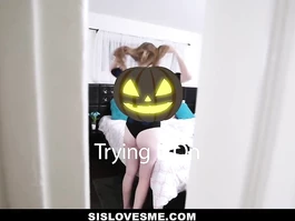 Awesome young blonde chick with cute and sexy medium young breasts is sitting on her knees on the couch between stepbrother's legs and hotly excites him with smooth deepthroat blowjob and then gets her hairy cunt fucked passionately hard
