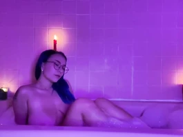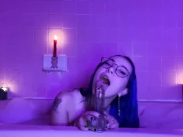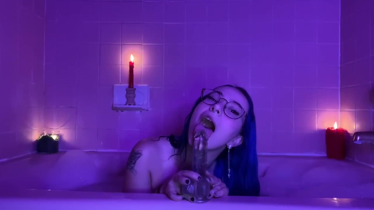 Buxom tight young girl with blue hair and exciting tight medium size breasts is sitting in the bathtub and hotly sucking big dildo sex toy and then setting it on the bath edge and enjoying sliding her plump cunt on it and flashing tight asshole