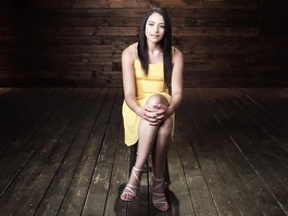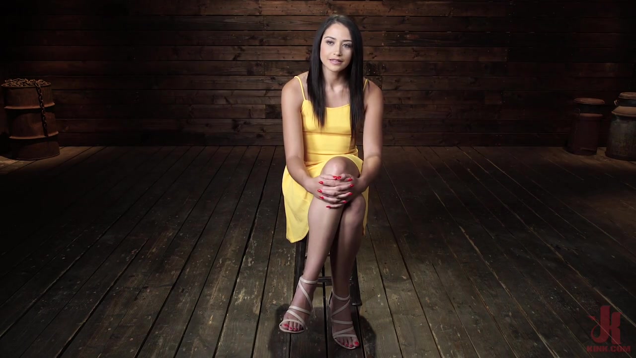 Stunning hot young brunette chick with exciting skinny slender shaped body got tied up and swinging on rope with gag ball in mouth and having her sexy haircut pussy excitingly stroked and roughly fucked with big steel dildo sex toy