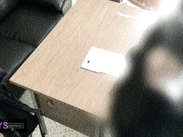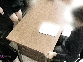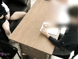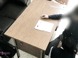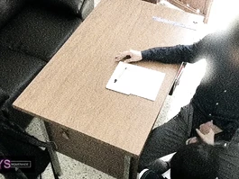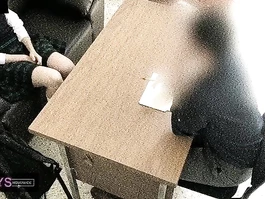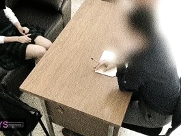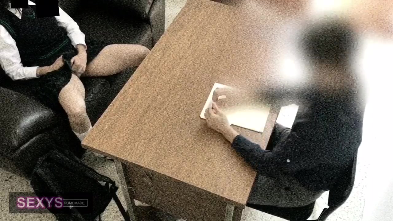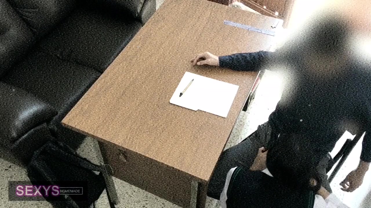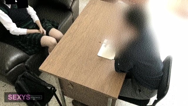 Sexy hot young Asian girl is sitting dressed in sexy charming high school uniform in front of her teacher and slightly spreading knees to flash her underskirt and then wide spreading legs and rubbing her young pussy before sitting on her knees and doing deepthroat blowjob to teacher and being recorded on security camera