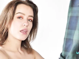 Skinny slender shaped young brunette girl with awesome tiny tits is getting undressed by rude fucker and being roughly fucked in deepthroat with big hard cock and then getting on top of the guy and riding his big hard cock with smoothly shaved pussy in cowgirl position