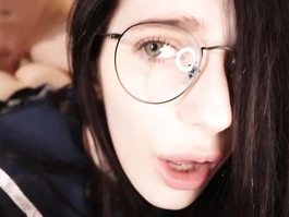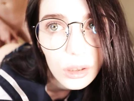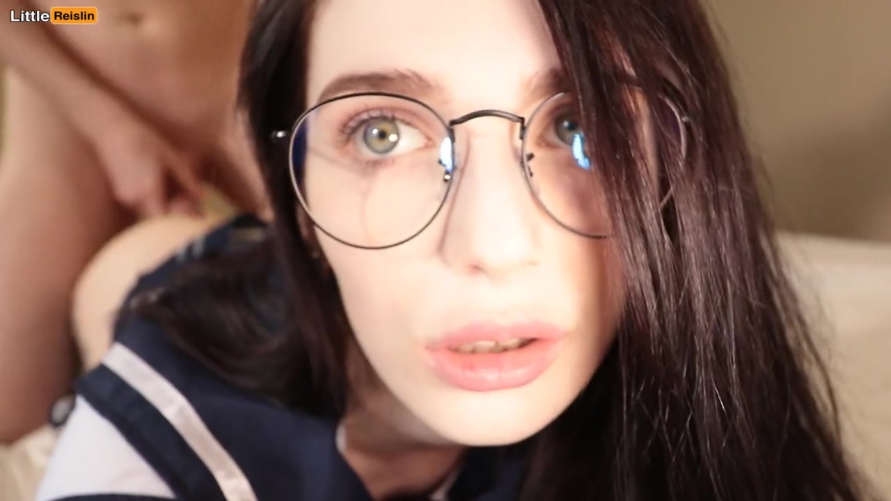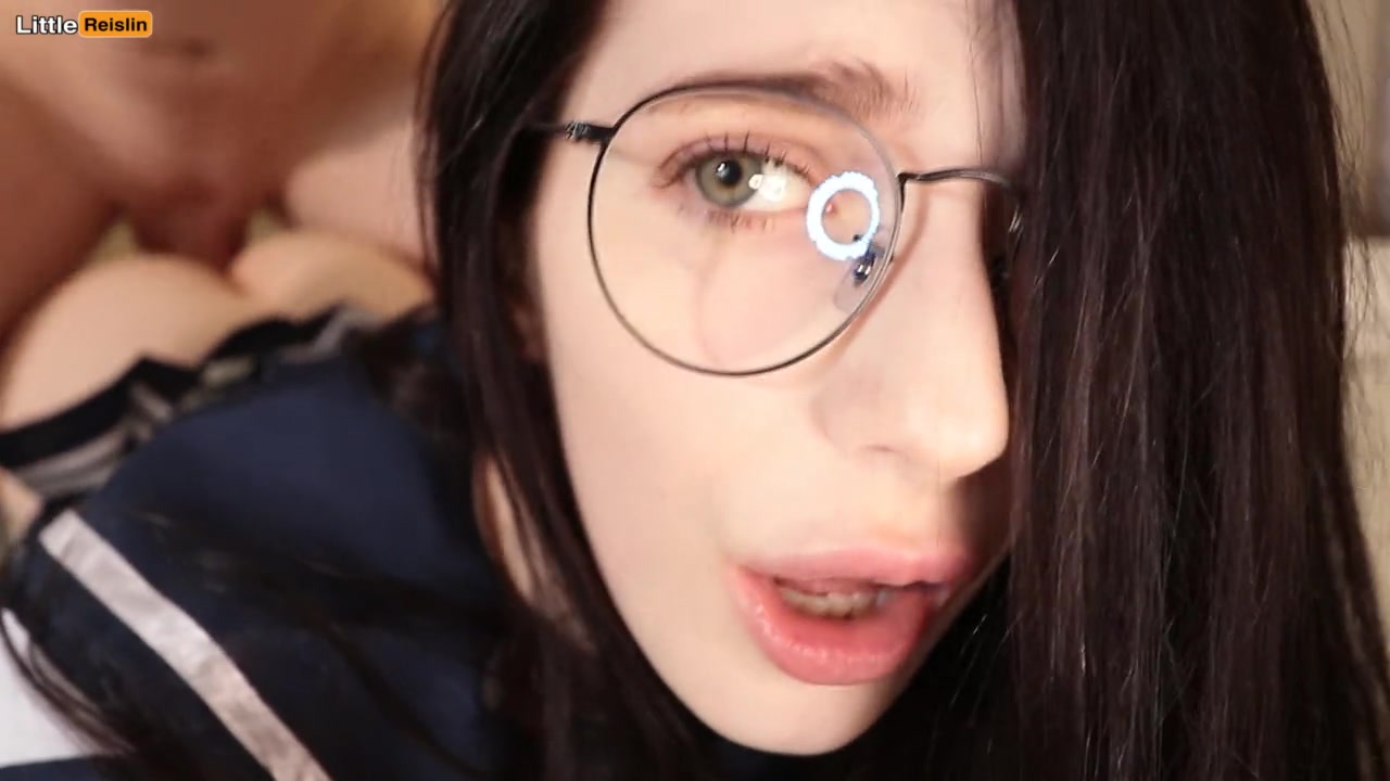Adorable young teen girl with sexy glasses wearing charming sexy high school uniform is lying on her stomach on the bed and being pleasantly fucked in her smoothly shaved pussy from behind and then wide spreading jelly buttocks and enjoying hardcore fuck in doggy pose