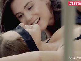 Steaming hot young lesbian girlfriends are enjoying hotly fondling each other dressed in black nylon stockings with garter belt and then lying down on the bed and excitingly licking young shaved lesbian pussy and passionately fingering