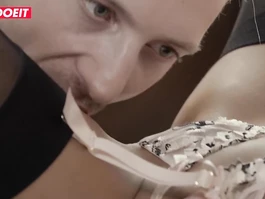 Stunning sexy shaped brunette girl in hot white lingerie is lying on the bed on stomach and hotly exciting her fucker friend with tight deepthroat blowjob and then squatting on big hard cock with sexy haircut pussy and fucking in cowgirl position