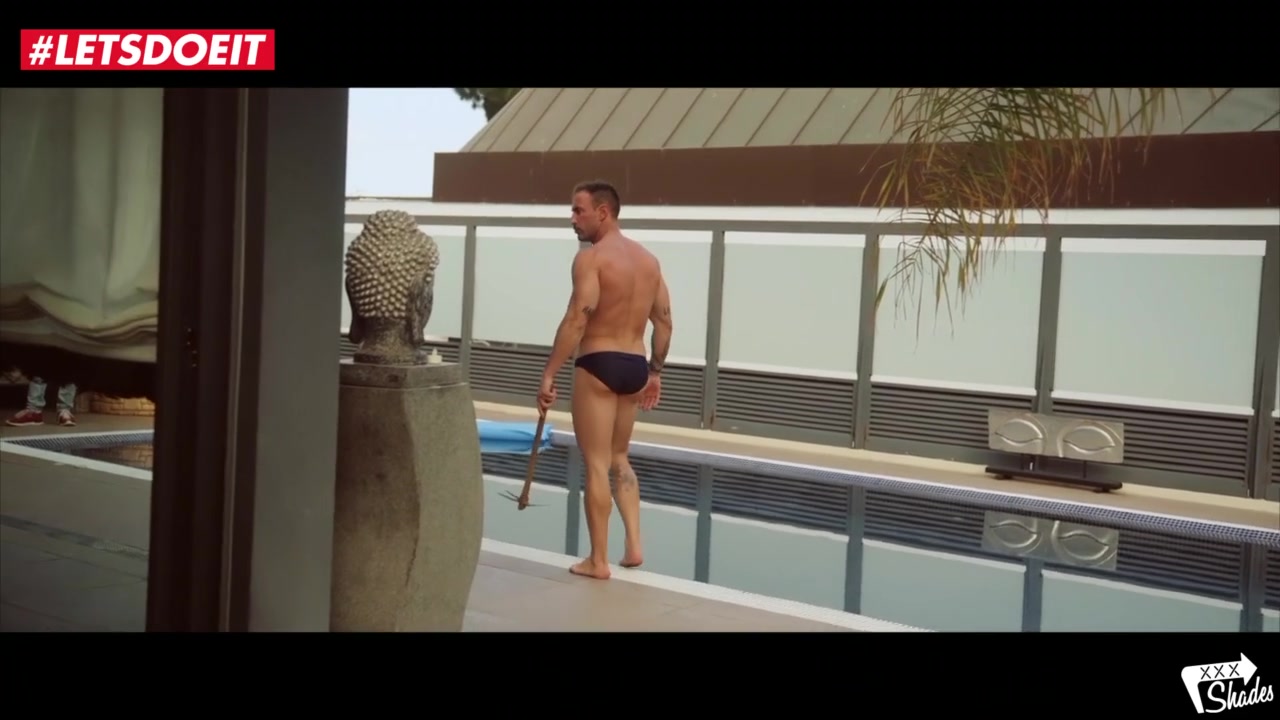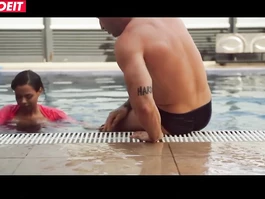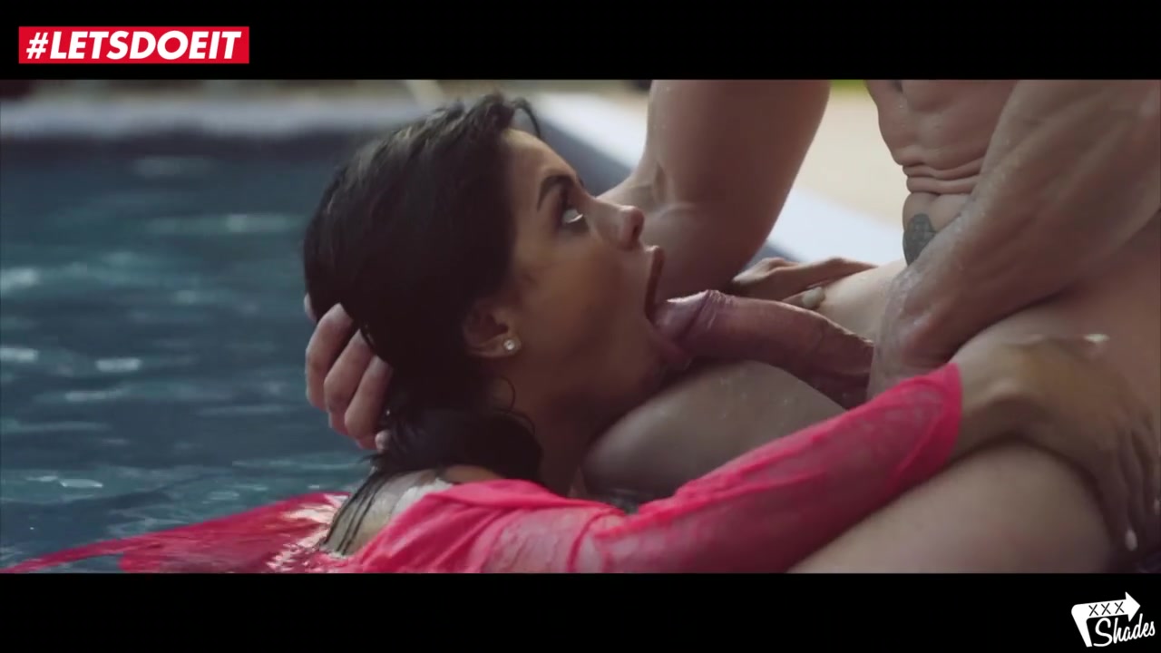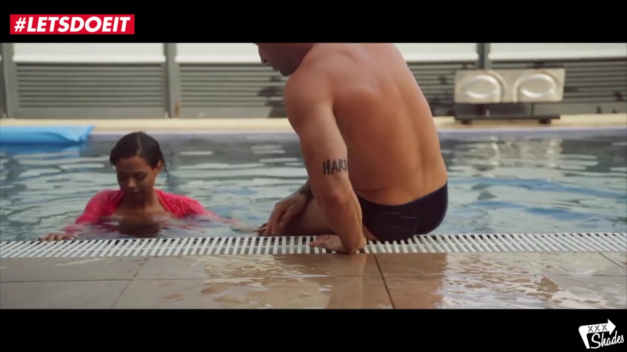 Stunning sexy shaped brunette chick is getting seduced for hot fuck in the pool and doing rough deepthroat blowjob to her strong muscled fucker friend and then being bent over in doggy pose and fucked up hard from behind in the pool before pleasuring hardcore in cowgirl position