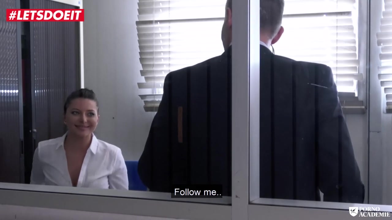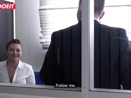 Appetizing tight brunette chick is sitting on armchair in the office and unbuttoning her sexy blouse to show off big juicy tits in hot red bra and then seducing young black guy and tightly erecting his big dick with deepthroat blowjob and enjoying interracial fuck on work desk
