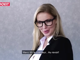 Blonde milf in sexy office suit and short skirt is getting seduced by her boss and standing down on the floor on her knees and doing tight blowjob to him until big dick erecting hard and then having her sexy shaved pussy fucked passionately hard in rather poses