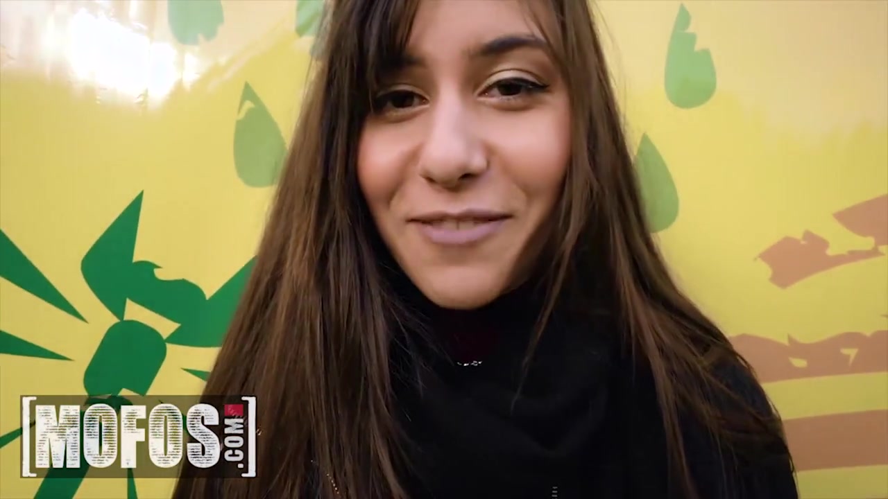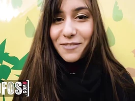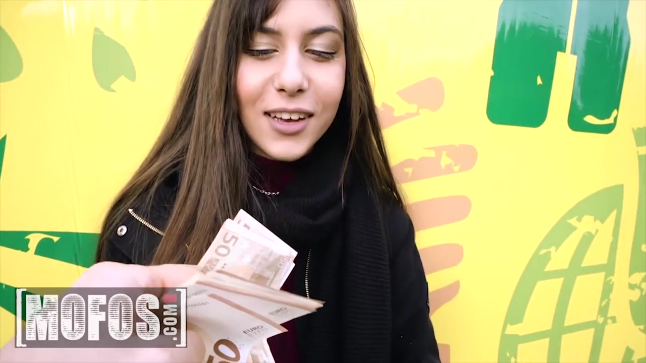 Adorable young brunette girl is being seduced by stranger to blowjob his cock outdoors for pretty much money and squatting in front of him and tightly erecting big cock with deepthroat suck and then pulling up short skirt and enjoying hot fuck