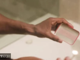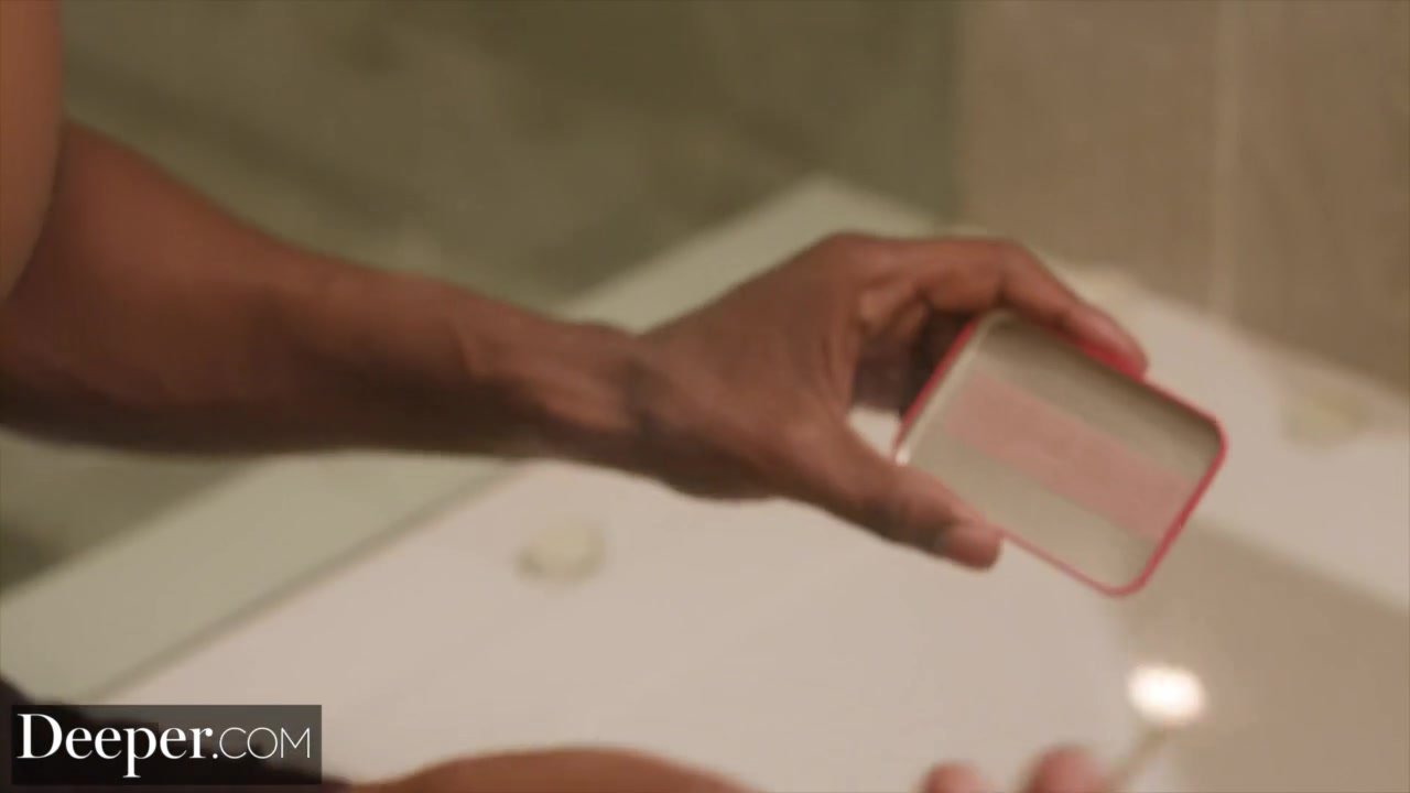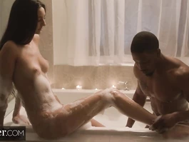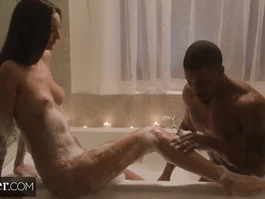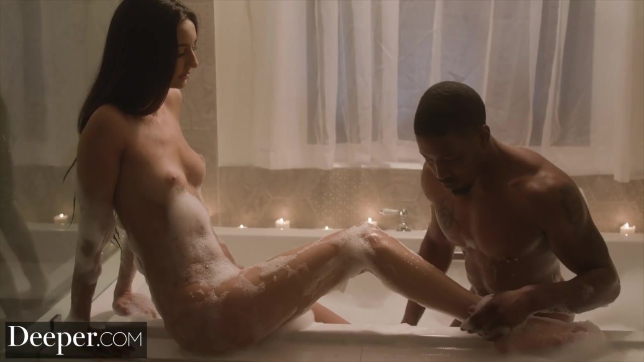 Steaming sexy shaped young brunette girl with tiny tits is sitting in the bath and having legs gently fondled by her black boyfriend before pleasing him with tight deepthroat blowjob and erecting big black cock and then getting tight shaved pussy destroyed
