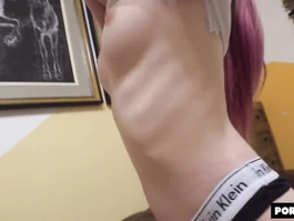 Petite young girl is pleasing her boyfriend with tight deepthroat blowjob until huge dick erecting hard and then getting on top and riding it with shaved cunt in cowgirl pose and having young bubble buttocks pleasantly stroked and tiny tits squeezed