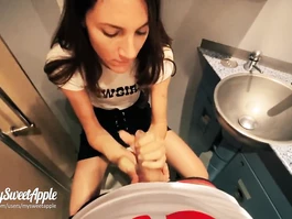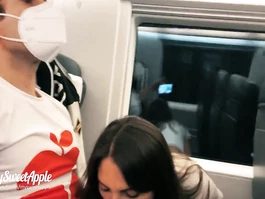 Steaming hot young brunette chick is getting seduced by some dude in train and having young pussy pleasantly stroked underskirt and hotly exciting from pleasant cunnilingus and then moving to the bathroom and doing tight blowjob before getting fucked