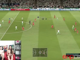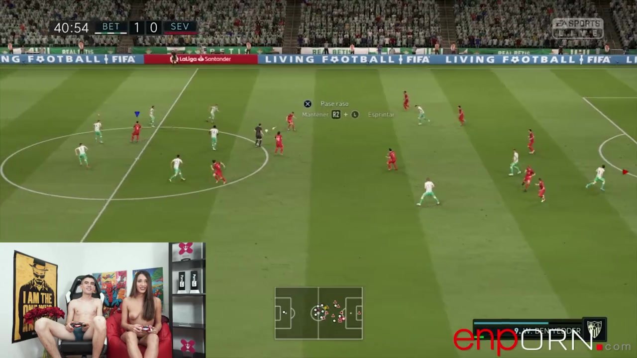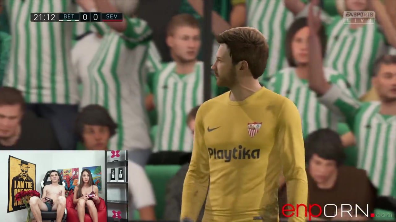 Skinny slender shaped young brunette chick is sitting with her young boyfriend nude and playing soccer on video game and pleasing the guy with tight blowjob until big dick erecting hard and then bending over in doggy pose and enjoying being pounded hard