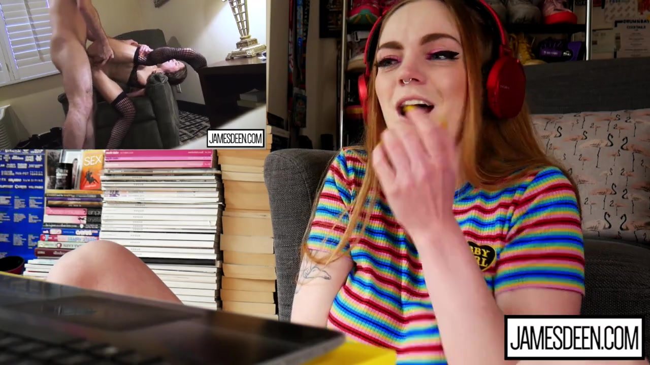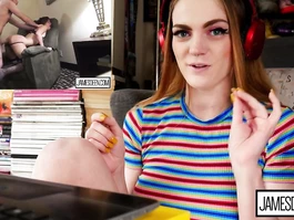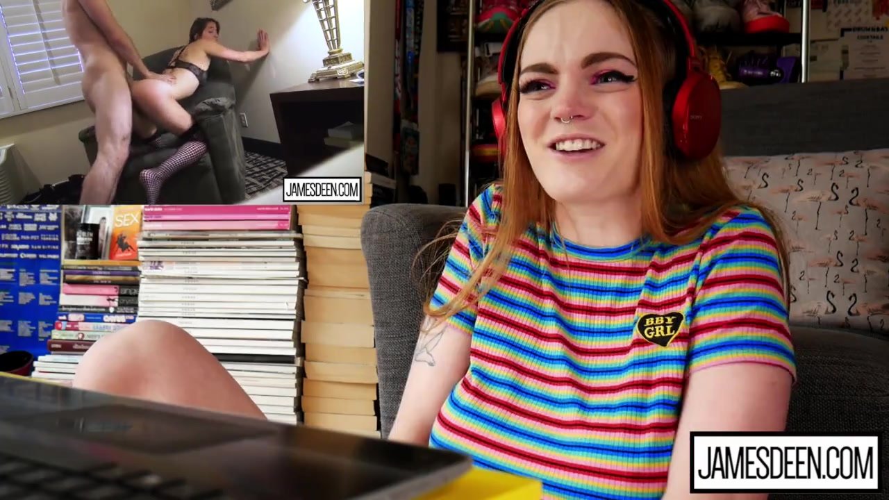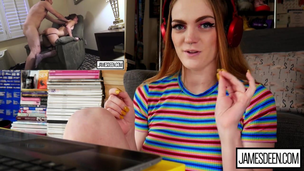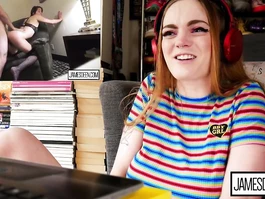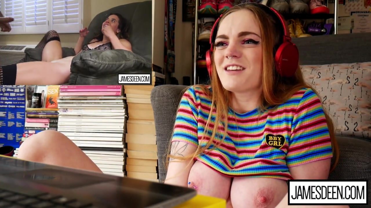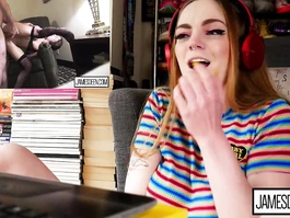Sexy redhead teen girl with big tight boobs is sitting in front of the camera and watching exciting hot webcam porn video and hotly exciting before taking vibrator sex toy and wide spreading legs and enjoying hotly masturbating shaved teen pussy