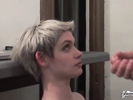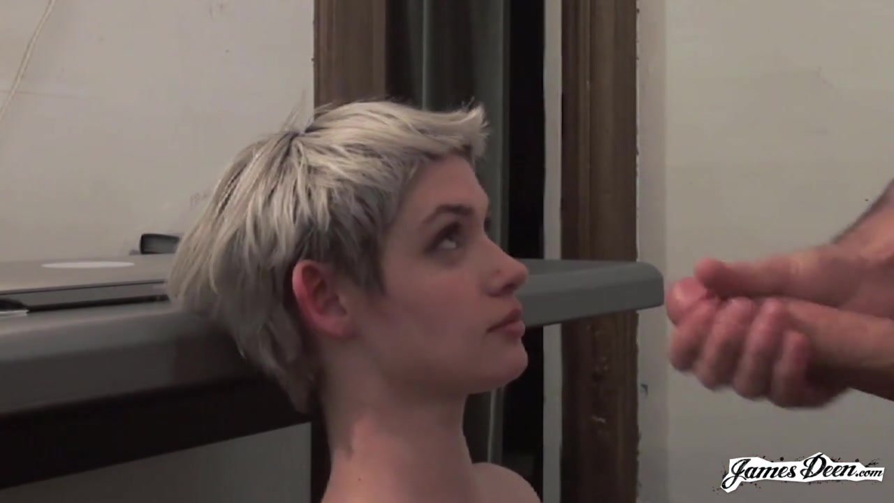 Steaming hot young blonde girl with short haircut is sitting topless on the couch and showing off tiny tits to her fucker friend and being gently fondled by him before doing deepthroat blowjob to him and wide spreading legs in black stockings and getting pounded in shaved pussy