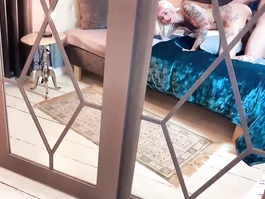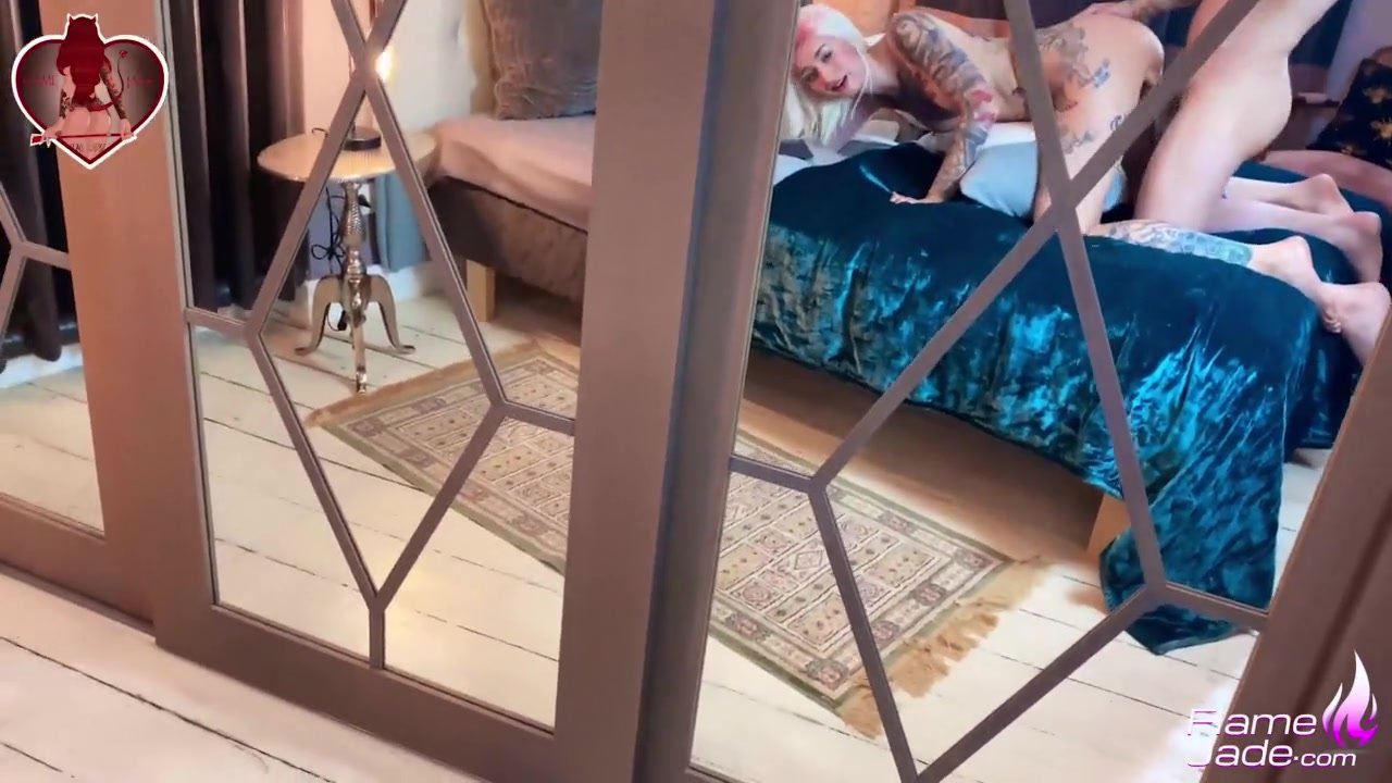 Young sexy shaped girl with pink hair and sexy color tattoos on chest is lying on the bed nude and watching webcam porn and doing footjob to her boyfriend before stuffing asshole with butt plug and having pierced cunt fucker roughly hard and then enjoying anal sex