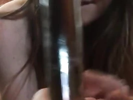 Exciting slender shaped redhead girl is bending over in doggy pose nude in front of the webcam and showing off her big jelly butt and yummy shaved pussy and then sitting with spread legs and passionately fucking cunt with steel dildo and stroking tiny clit