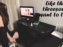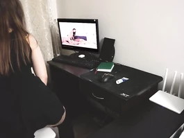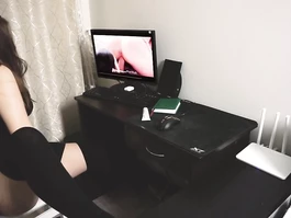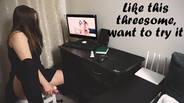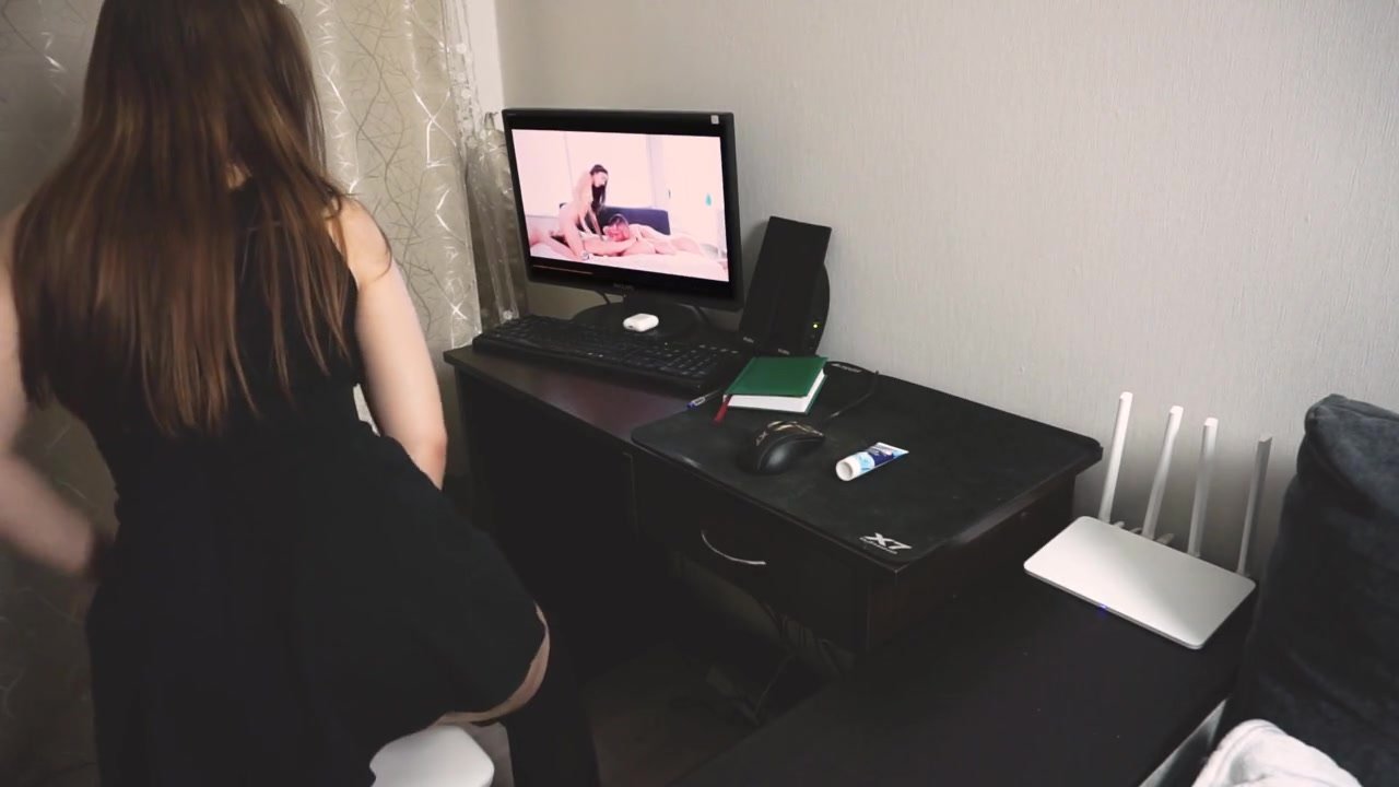 Horny chick is sexy black short dress is enjoying watching webcam porn videos and gently fondling her belly and shaved pussy before sitting on chair and sliding her plump wet pussy on big pink dildo dick and stroking tiny clitoris