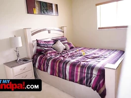 Young blonde girl with appetizing sexy bubble butt is showing off bare ass in front of her step grandpa and then coveting to him and pleasing with tight deepthroat blowjob and rubbing juicy boobs on his face before fucking hard in cowgirl pose